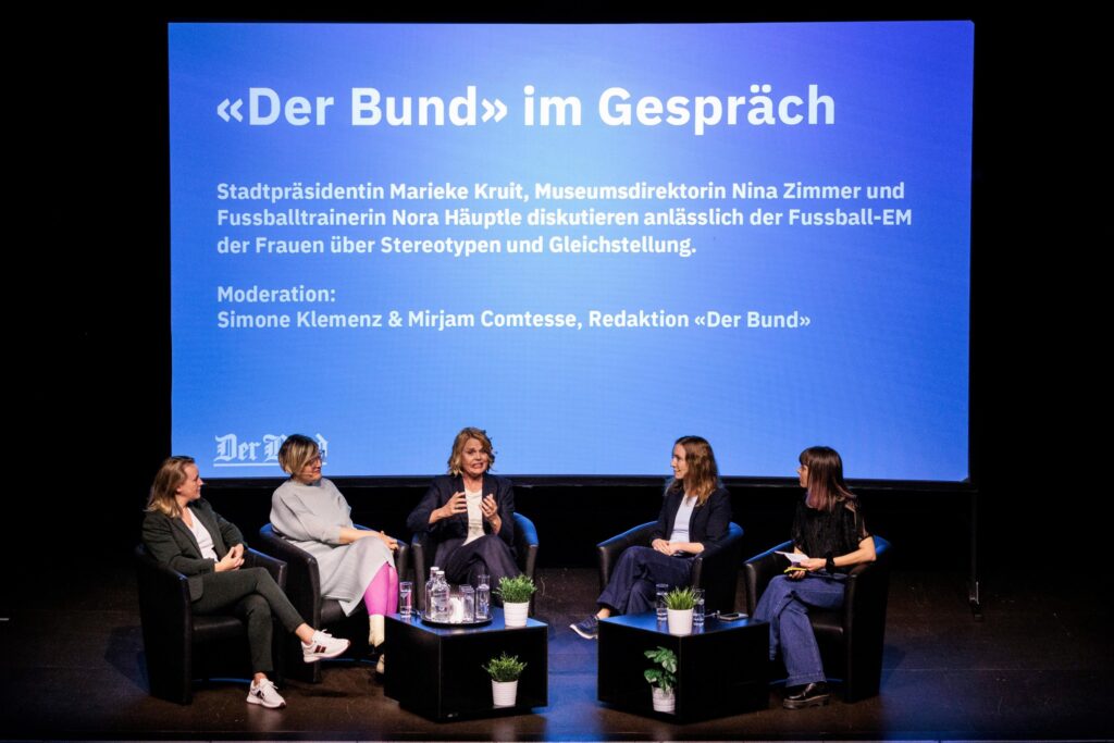 «Ich wollte Fussball spielen und mich nicht mit Männern vergleichen» Am Dienstagabend diskutierten Stadtpräsidentin Marieke Kruit, Museumsdirektorin Nina Zimmer und Fussballtrainerin Nora Häuptle im Bierhübeli in Bern. In gut 100 Tagen beginnt die EM-Fussballmeisterschaft der Frauen 2025, die unter anderem in Bern stattfindet. Die Stadtpräsidentin Marieke Kruit erzählte am Dienstagabend im Berner Bierhübeli zum Auftakt…