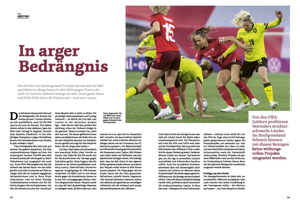 Für drei der vier letzten grossen Turniere konnte sich die Nati qualifizieren. Jüngst hatte sie aber Mühe gegen Teams, die noch vor kurzem mühelos besiegt wurden. Dank guten Ideen und FIFA-Hilfe holen die Kleinen auf – und zwar rasant. WWW.ZWOELF.CH #91 Juli/August 2022 S.22-25 / Mämä Sykora